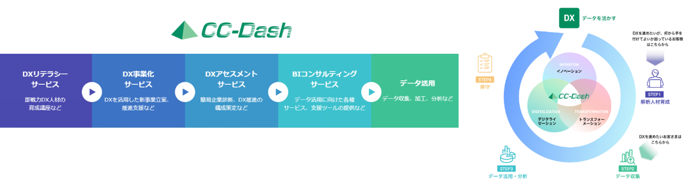 「CC-Dash」(https://xcc-dash.jp/)は、データ活用によってお客様のDX推進を支援する当社独自のフレームワークです。DXを推進する際の各フェーズ(①知る ②つくる ③集める ④整える ⑤分析する ⑥活かす)における様々な課題に対し、テンプレート化と各種コンサルティングサービスをお客様に提供しています。加えてアライアンス等によってソリューションサービスのラインナップを随時追加・拡充していくことで、お客様のDX推進状況に合わせた最適な支援策を提供してまいります。