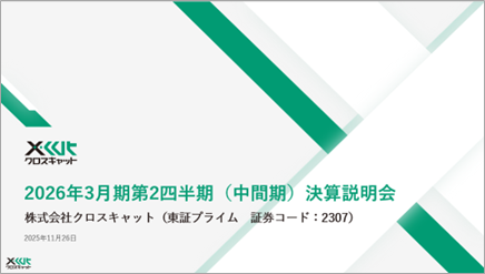 株式会社クロスキャット(本社:東京都港区、代表取締役社長:山根光則、以下クロスキャット)は、「2026年3月期第2四半期(中間期)決算説明会」の動画を公開したことお知らせします。機関投資家・アナリストの皆様をはじめ、個人投資家の皆様、当社にご関心をお寄せいただいている多くの方々にご覧いただきたく、今回の説明会動画を用意しました。