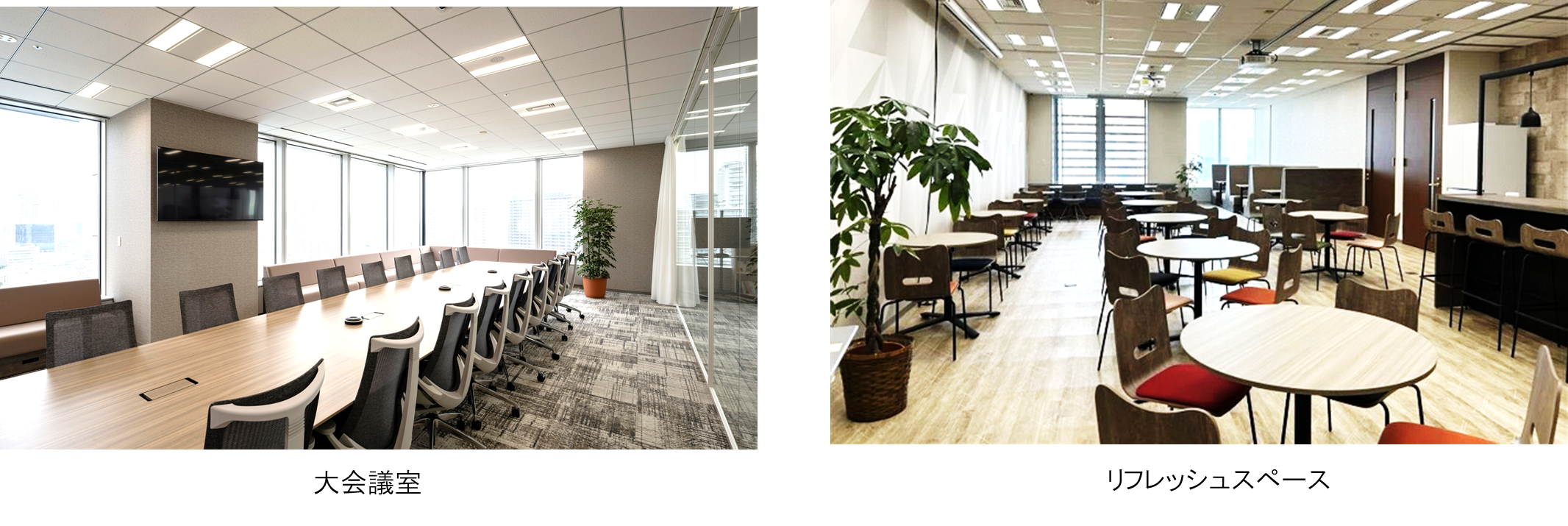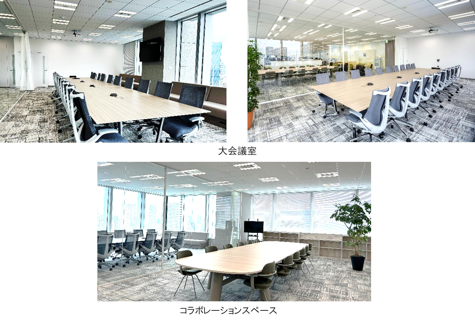 新設された大会議室は、主要会議のほか、社内外の打合せや採用イベントなどに利用できる多目的なスペースです。また、この大会議室に隣接するスペースに12席のビッグテーブルを設置し、部署を越えたチームミーティングなどに活用できるコラボレーションスペースとして整備しました。