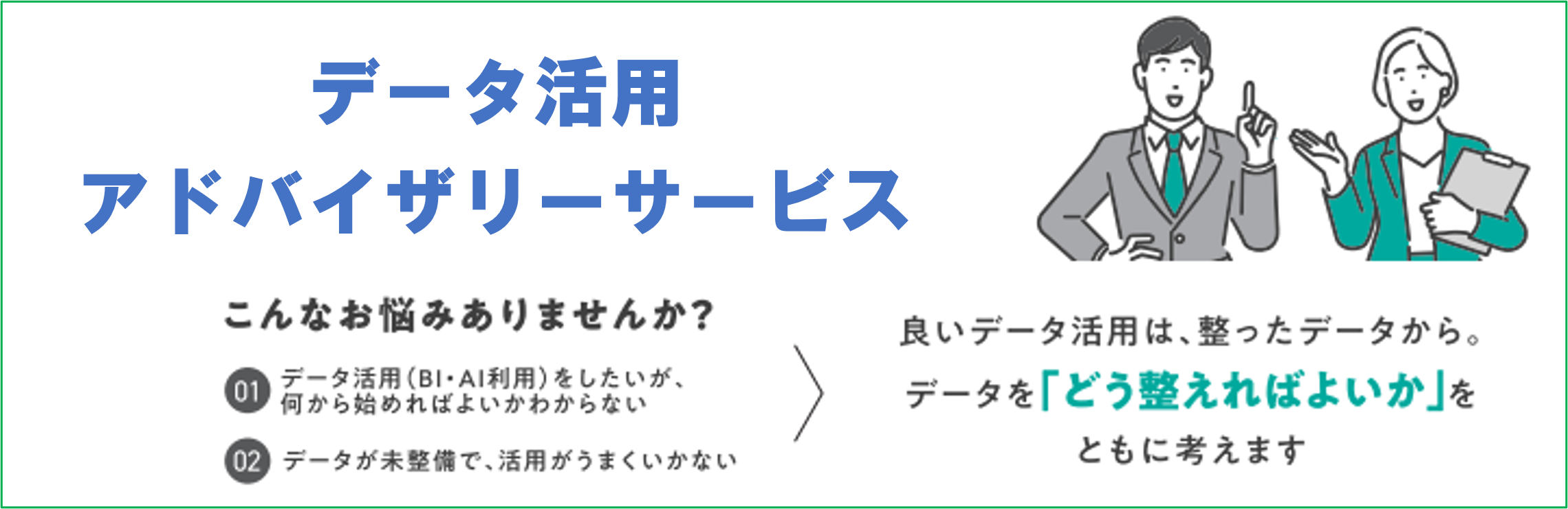 「データ活用アドバイザリーサービス」は、AIやBIの活用を見据え、企業が保有するデータを「活用できる状態」に整えるためのアドバイザリーサービスです。データ、システム基盤、データの見せ方・使い方、運用体制といった複数の観点から現状を整理し、今後のAIやBIの活用につながる実行可能な方針を導き出します。当社は、BIビジネスを中核事業の一つとして、長年にわたりデータ分析基盤の構築・活用支援に取り組んできました。その中で蓄積してきた、「どのようなデータ整備がAIや高度分析に効くのか」、「どこでつまずくと活用が止まるのか」といった実践的な知見を、本サービスに集約しています。