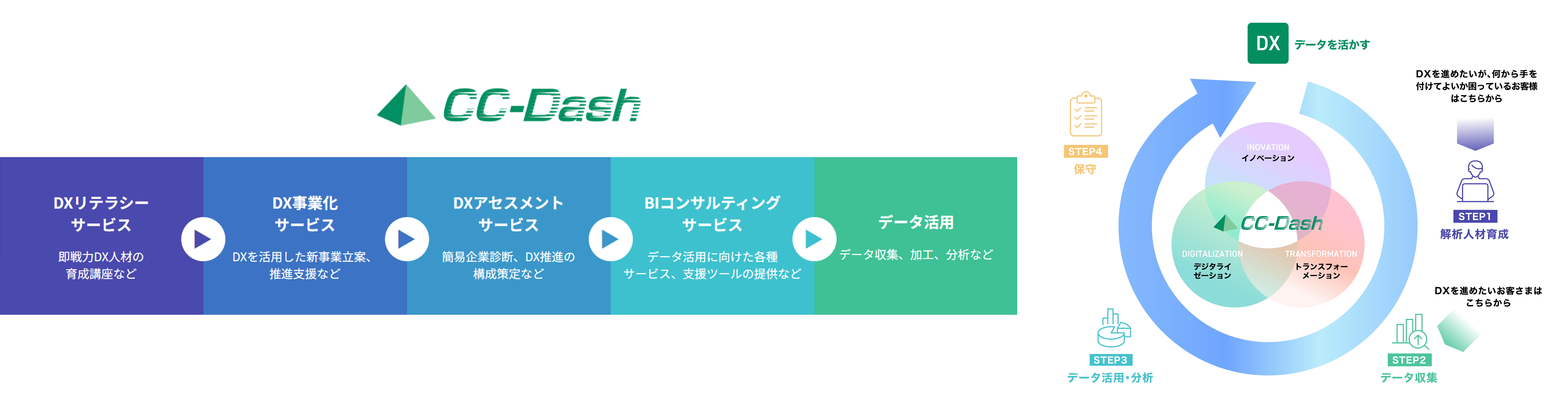 「CC-Dash」( https://xcc-dash.jp/ )は、データ活用によってお客様のDX推進を支援する当社独自のフレームワークです。DXを推進する際の各フェーズ(①知る ②つくる ③集める ④整える ⑤分析する ⑥活かす)における様々な課題に対し、テンプレート化と各種コンサルティングサービスをお客様に提供しています。加えてアライアンス等によってソリューションサービスのラインナップを随時追加・拡充していくことで、お客様のDX推進状況に合わせた支援策をワンストップで提供します。